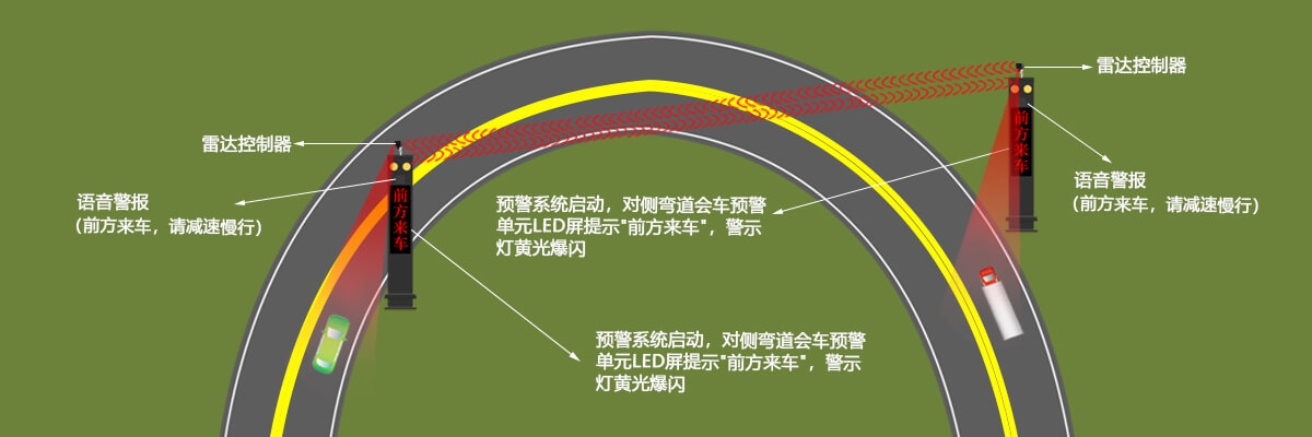 星标弯道会车预警系统在弯道两端道路的右侧路边各安装一套弯道会车预警单元,当其中一侧雷达探测器优先探测到有即将过弯车辆时,另一侧的预警单元LED屏显示红色“前方来车”字幕,警示灯爆闪黄光,同时语音警报响起:“前方来车,请减速慢行”,提醒司机对向来车,注意安全;常规状态下,弯道会车预警单元LED屏显示绿色“弯道慢行”字幕, 警示司机前方弯道,请小心慢行