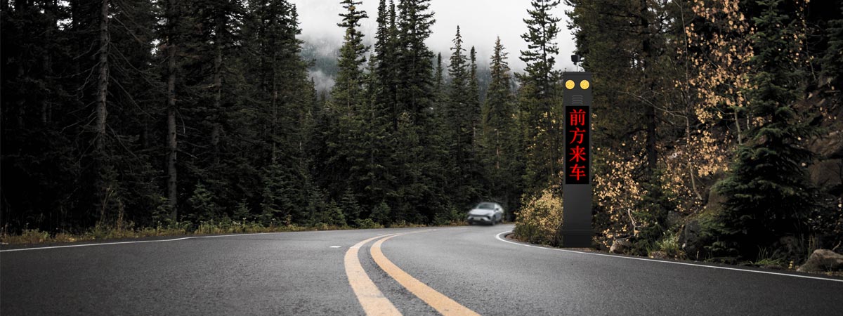 • 声光立体警示,警示效果强:当对向来车时,LED屏显示红色“前方来车”字幕,警示灯爆闪黄光,同时语音警报响起:“前方来车,请减速慢行”
