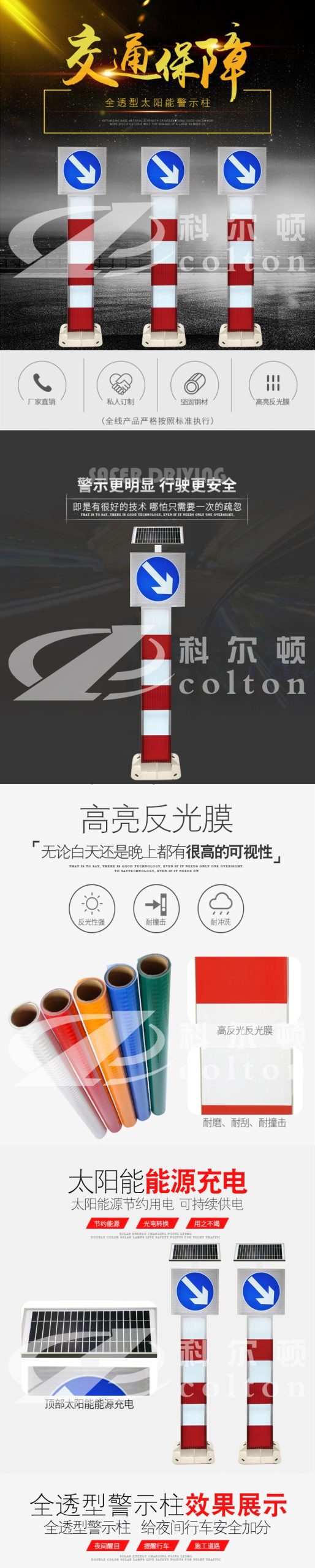 该产品使用高亮反光膜,无论白天还是晚上都有很高的可实现。太阳能能源充电,太阳能源节约用电,可持续供电,节约能源、光电转换、用之不竭。满焊工艺抗撞压不脱焊,立柱底座采用专业的满焊工艺焊接,安装牢固更防撞抗压,安装牢固、满焊工艺、安装便捷。加厚壁管质量好耐久度长,本产品采用加厚钢板耐撞耐腐蚀耐日晒,加厚材料、经久耐用、防腐防晒。